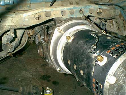 | The Bus Project | Here is a close up of the motor hanging off the back of the transmission, just like a bug motor does. We will see if additional bracing will be needed in the form of a rear mount. The electric weighs less than a bug motor... but I'm not convinced yet. | |||||
